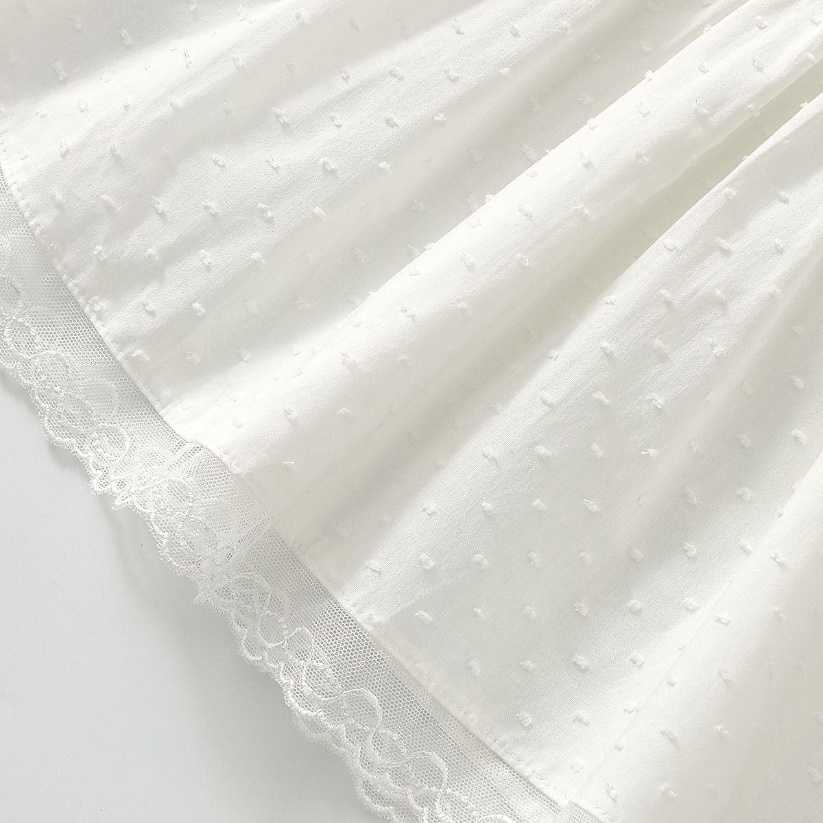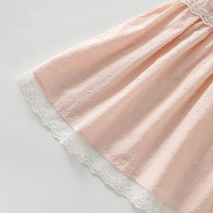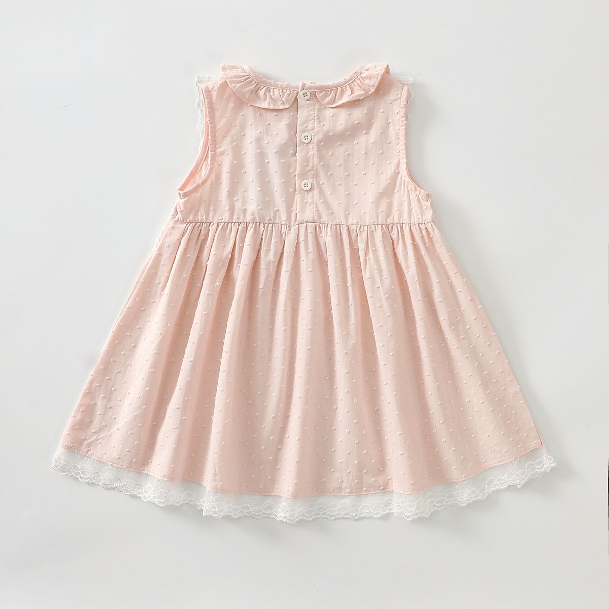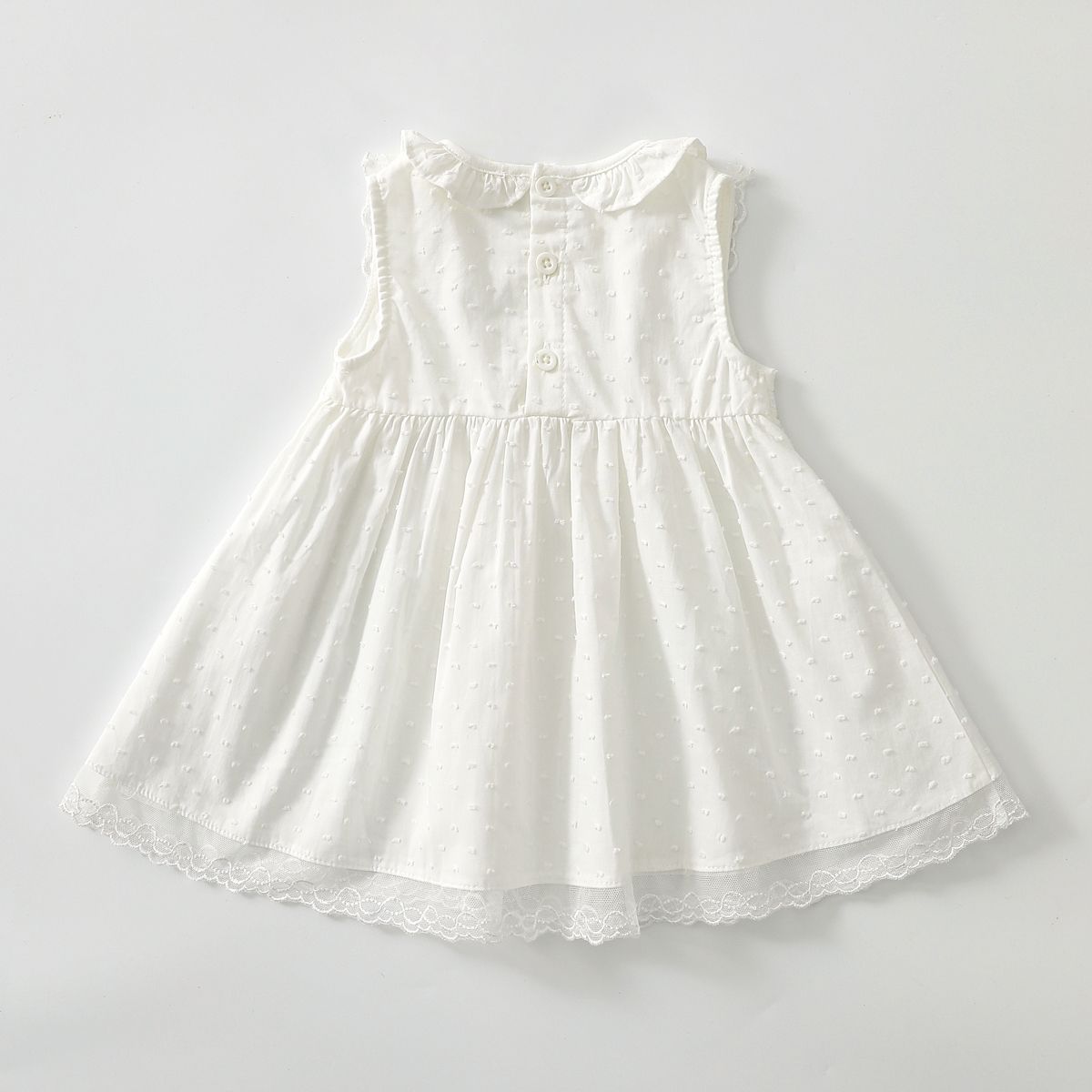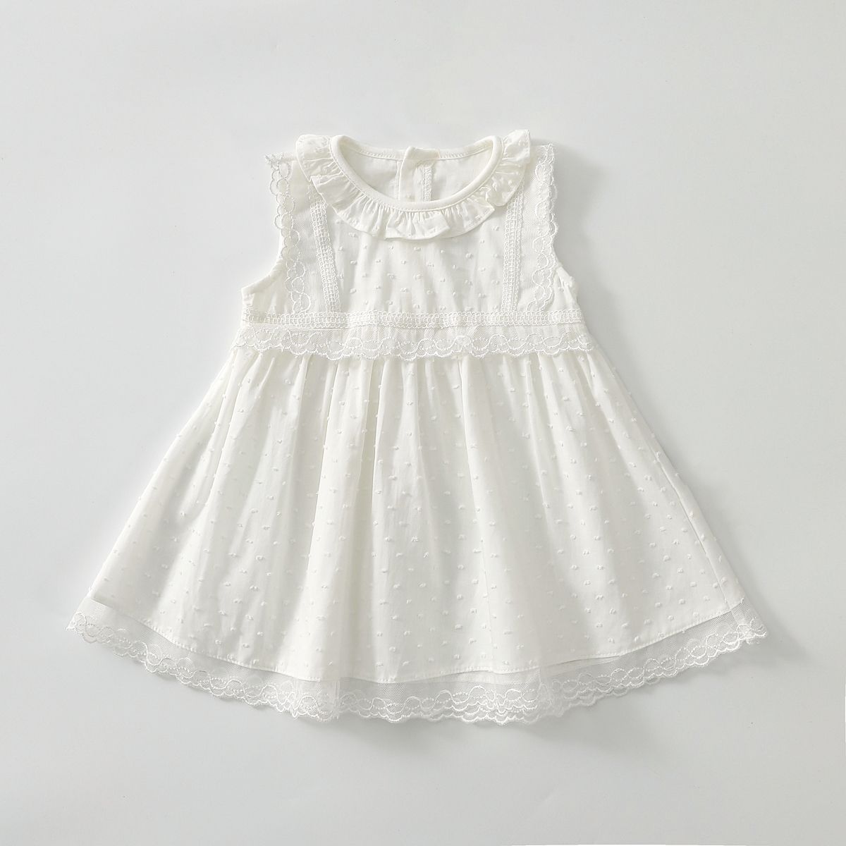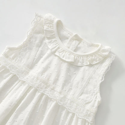 فستان بناتي دانتيل بدون أكمام مع ياقة مستديرة، قطن خفيف ومسامي، تصميم أنيق ومريح مثالي للاستخدام اليومي في الصيف.